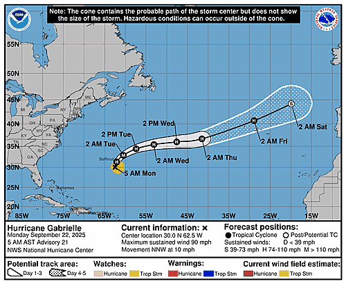 CyclonesHurricane Gabrielle Graphics Last updated: September 22, 2025 11:02 am ByNHCByNHC Share 0 Min Read Hurricane Gabrielle Graphics SHARE 5-Day Uncertainty Track last updated Mon, 22 Sep 2025 09:03:10 GMT Wind Speed Probabilities last updated Mon, 22 Sep 2025 09:22:14 GMT Share This Article Email Copy Link Print Previous Article Hurricane Gabrielle Forecast Discussion Number 21 Next Article Summary for Hurricane Gabrielle (AT2/AL072025)